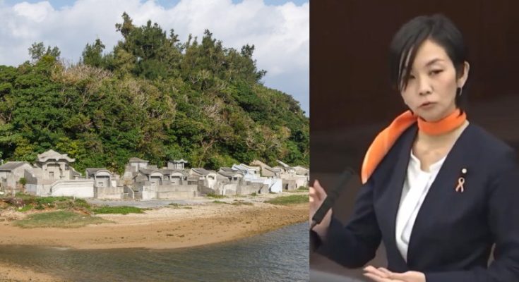 A Japanese burial site at Onna Village in Okinawa (Wikimedia Commons/CEphoto, Uwe Aranas) and MP Mizuho Umemura (Screen-grab from X)