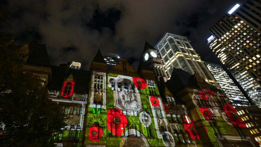 These anniversaries would reportedly be observed with a special commemorative lighting display projected nightly from Wed, Nov 5 to Tue, Nov 11, from 6 to 11 p.m., onto the west side of Old City Hall as a powerful visual tribute to those who served and the history of the Toronto Cenotaph.